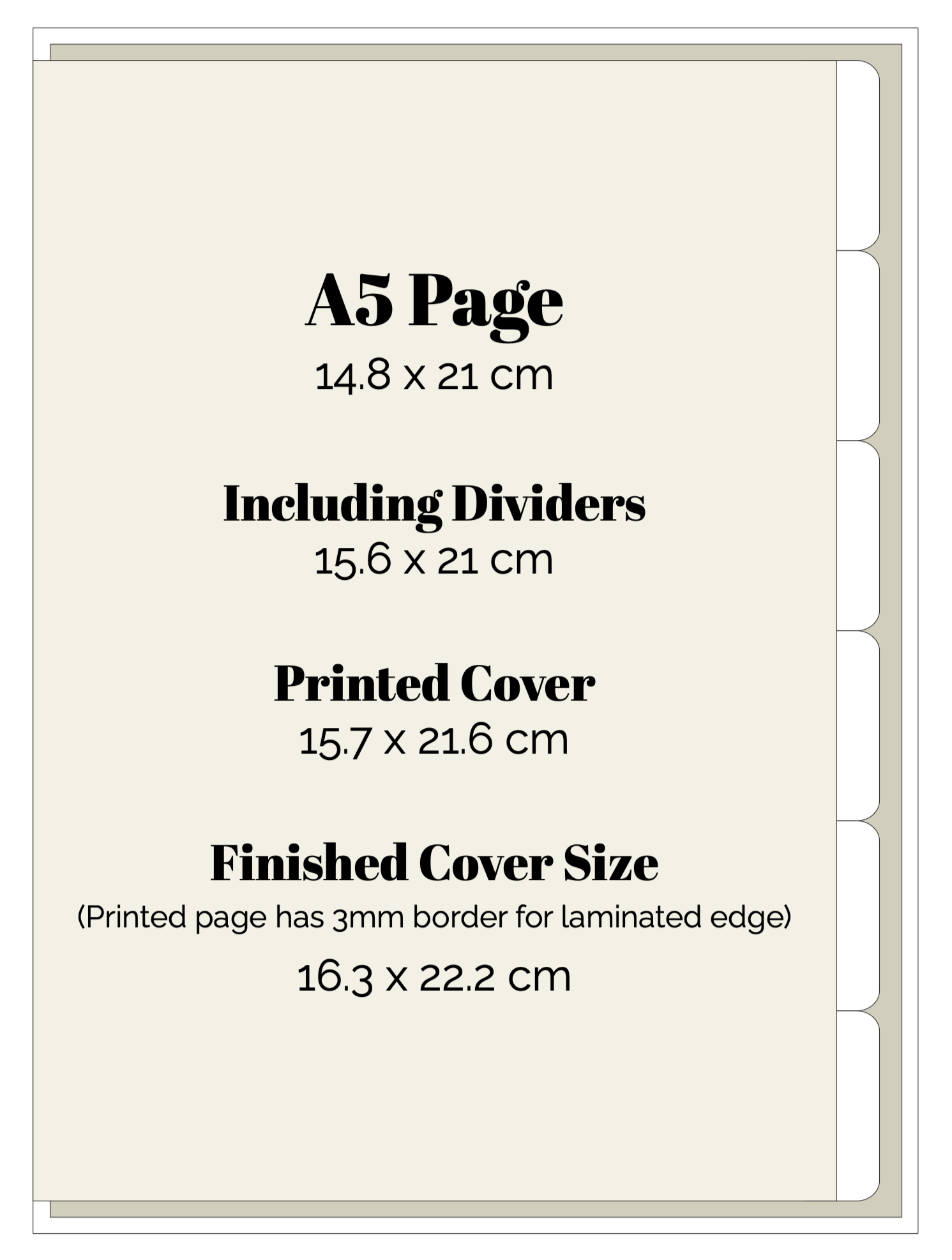 My recommendation for this would be to add 3mm at the top of your page, and 3mm at the side of your page - remembering to take the dimensions of any dividers into account. Mine added an additional 8mm of tabs at the side. You should also consider that with larger, more full rings, the pages in the middle will poke out a little more, so it’s worth adding a little on the horizontal page measurement.