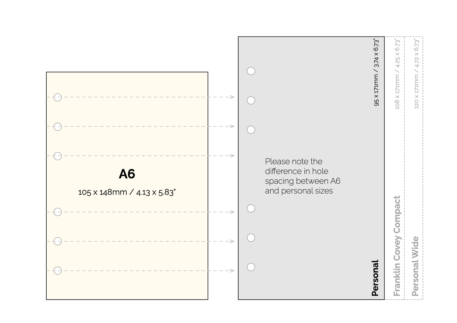 Hole spacing: A6 holes are quite close to the top and bottom of the page with a small gap between sets. Personal holes have more space between the sets, and there's more room at the top and bottom of the page.