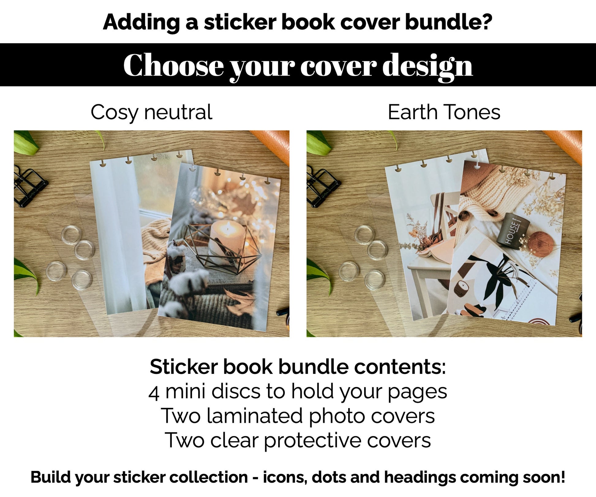 These are compatible with the Sort Stuff Out sticker books, so if you'd like to have them disc punched, please choose the option from the drop-down menu. If you'd like to include a cover bundle, this option is also available.