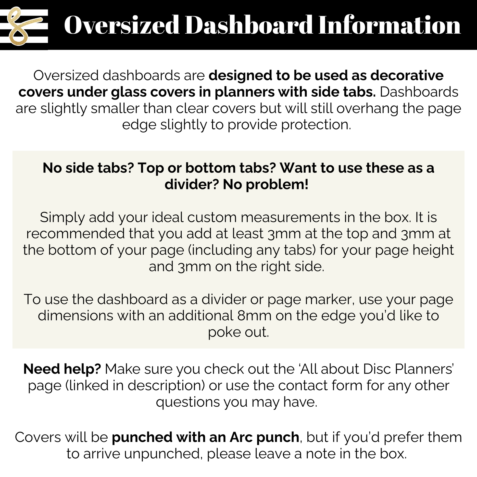 Oversized dashboards are designed to give support and protection to your disc planner. They can be made using any image you see in the shop, whether it's a dashboard or even a journal card - just enter your choice in the box. If you'd prefer, you can send an email to ellie@sortstuffout.co.uk after purchase with a screenshot. Plain white and black oversized dashboards are also available - please also note this choice in the box.