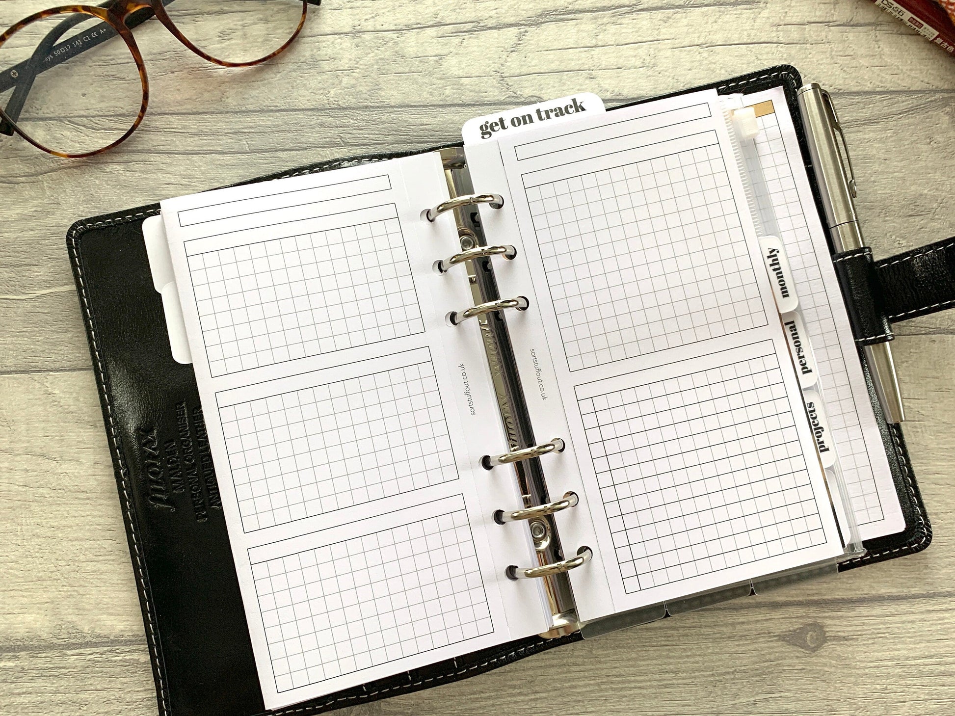 Are you trying to make personal size work for you? If you find the page size a little too narrow, foldouts are for you! The weekly foldout gives you SO much space! If you saw my autumn setup on YouTube (https://youtu.be/OTdaLWuRDV0), these will look familiar. There are lots and lots of boxes and sections on here, so they're brilliant for when you want to get detailed with your weekly planning. On the front page, there are four sections - one for your top 5, and a wide column box. Inside, there are four boxes and a generous task box. When you open it up, you'll find a layout that's similar to my extended day inserts, plus with a habit tracker, a huge task area, and two notes boxes. On the back, there's another top 5 box, and two additional notes boxes. These boxes are all left blank for your own headings, so you can add colour and text wherever you need it to be, and change it up each week if you like! As an extra tip... try snipping the holes on these so you can pull them out of your planner easily to make writing on them even easier!