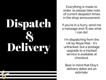 These items are hand-made, and usually made to order by me in my home studio. Please allow time for everything to be made before dispatch. Dispatch times will be updated regularly and advertised on the shop banner. Of course, if you're in a hurry for everything, just email me at ellie@sortstuffout.co.uk and let me know!