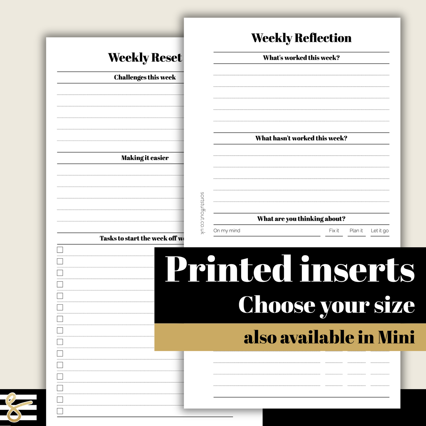 Are you looking for something to help you get yourself ready at the start of the week? Do you feel like you need to build in a little time for reflection in your week? These inserts are for you! I have these sheets at the end of the week in my planner - the reflection side gives me a little time to think about what's worked and what hasn't. There's a space for me to write all of the things that are hanging over me, and then I tick off whether I'm going to fix them now, plan a time to sort them out, or just let them go. On the other side, I think about what I can do to push the reset button for the upcoming week. There's a space for you to consider the challenges facing you, how to make them easier to handle, and a task area so you can think about what you can do to give yourself an easy ride through the week.
