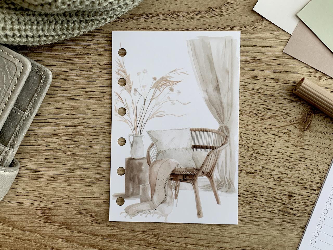 Wicker Chair Watercolour Neutrals Dashboard - Fits A5, B6, Personal Wide, Personal, A6, Pocket, Mini Ring Planners. Protective Cover.